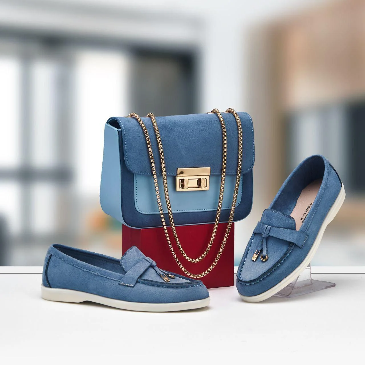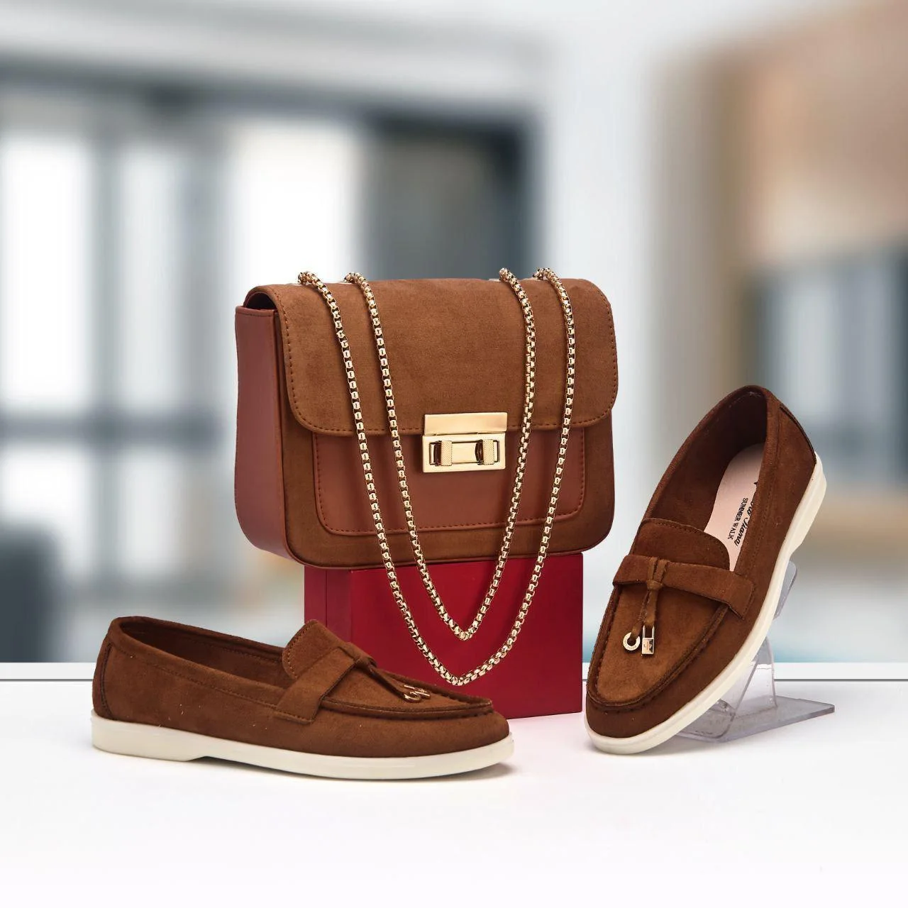 طقم نسائي أنيق DAN يجمع بين الحقيبة والحذاء بتصميم متناسق يمنحك إطلالة راقية وعصرية في مختلف الإطلالات اليومية. الحقيبة مخدومة بخامة عالية الجودة مع قفل أنيق وسلسلة معدنية تضيف لمسة فخامة، كما توفر مساحة عملية لوضع كل الضروريات.